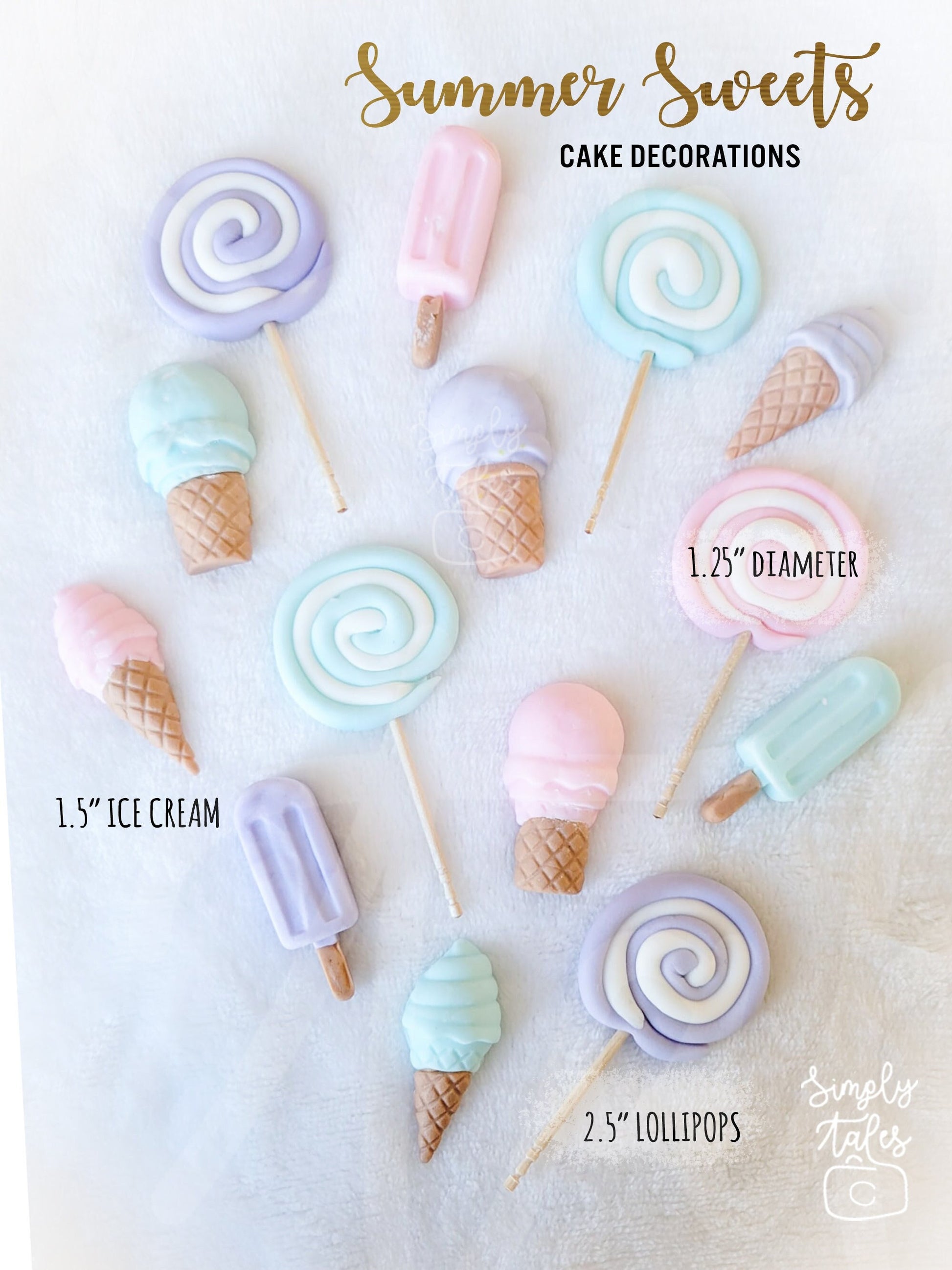24 Sweet Summer Delights cake decoration, fondant topper, ice creams, lollipops, popsicle, ice cream cone, Birthday Cake Topper